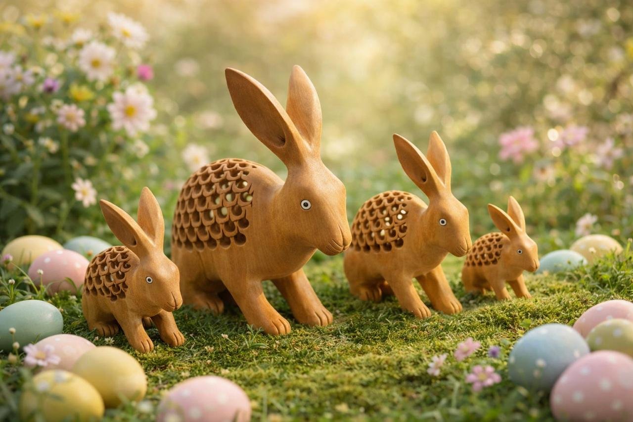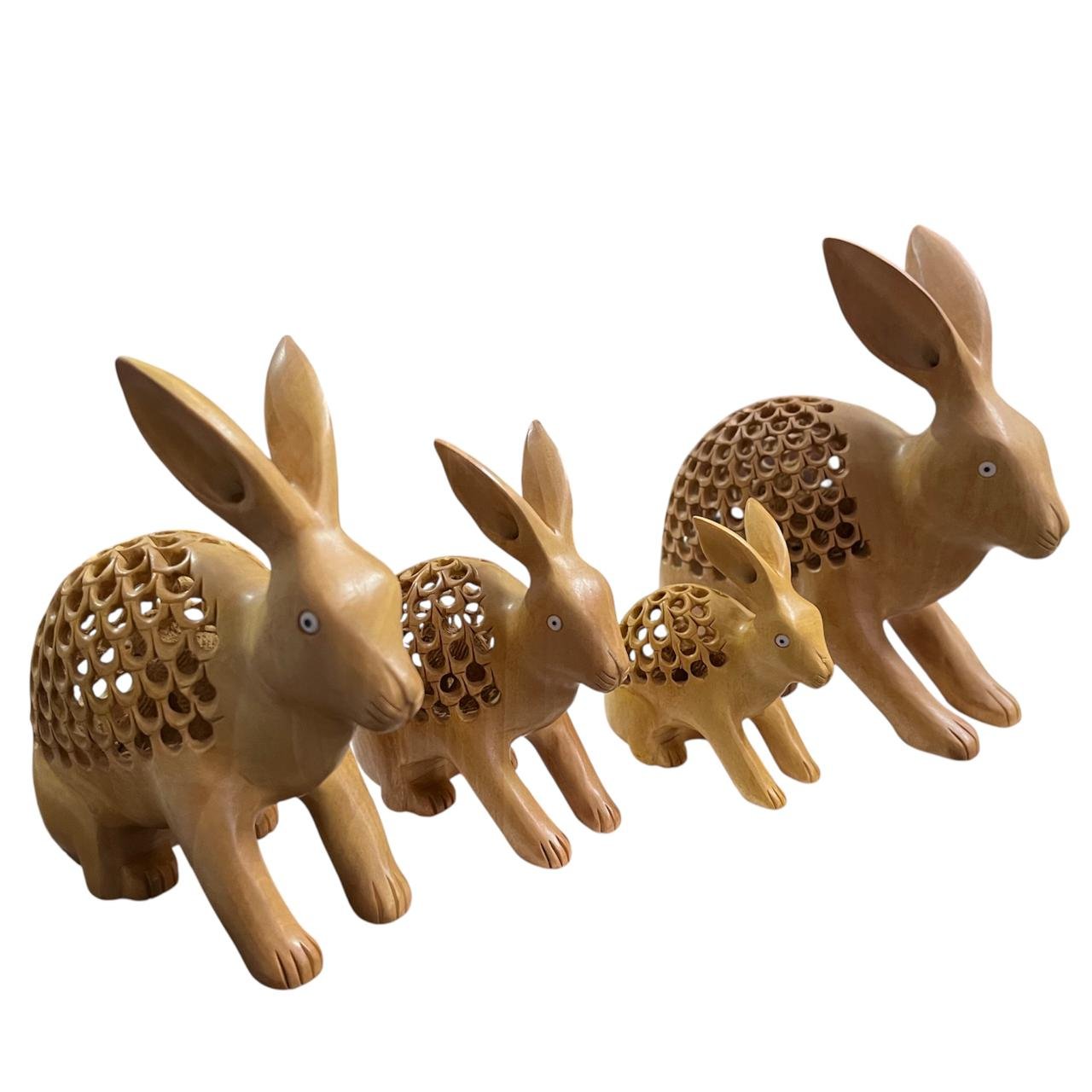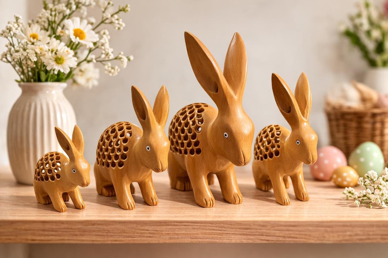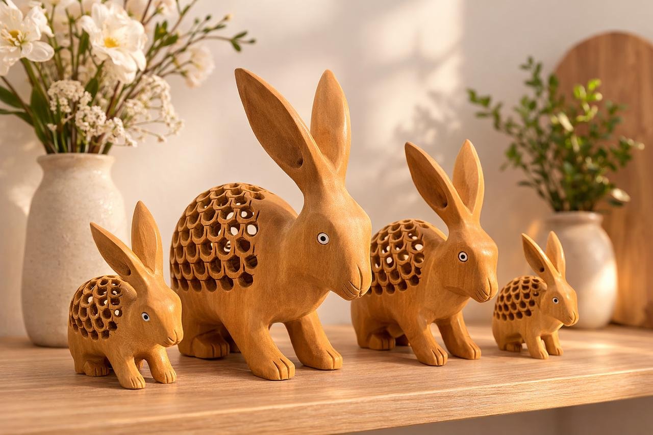 Celebrate the beauty of spring with this charming set of 4 handmade wooden undercut bunny figurines. Thoughtfully crafted from premium natural wood, each bunny features smooth finishing and elegant undercut detailing that highlights the organic grain and unique character of the wood.