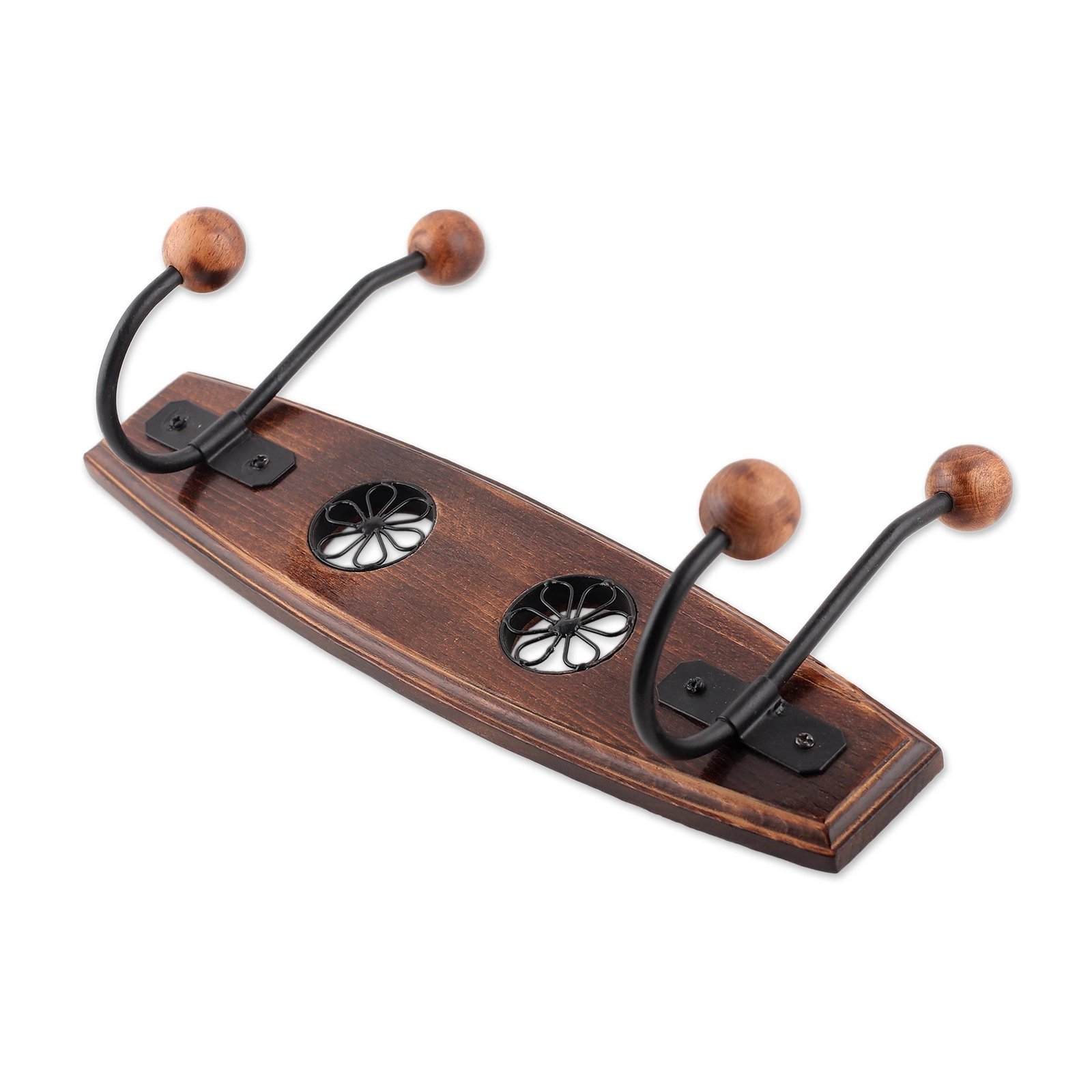 Bring order and elegance into your space with this eye-catching coat rack adorned with exquisite jali-style openwork floral motifs and two sturdy iron hooks. Meticulously handcrafted from beech wood, this functional accessory from India, allows you to effortlessly organize your keys, hats, bags, garments, towels and beyond while adding a touch of sophistication to your surroundings.