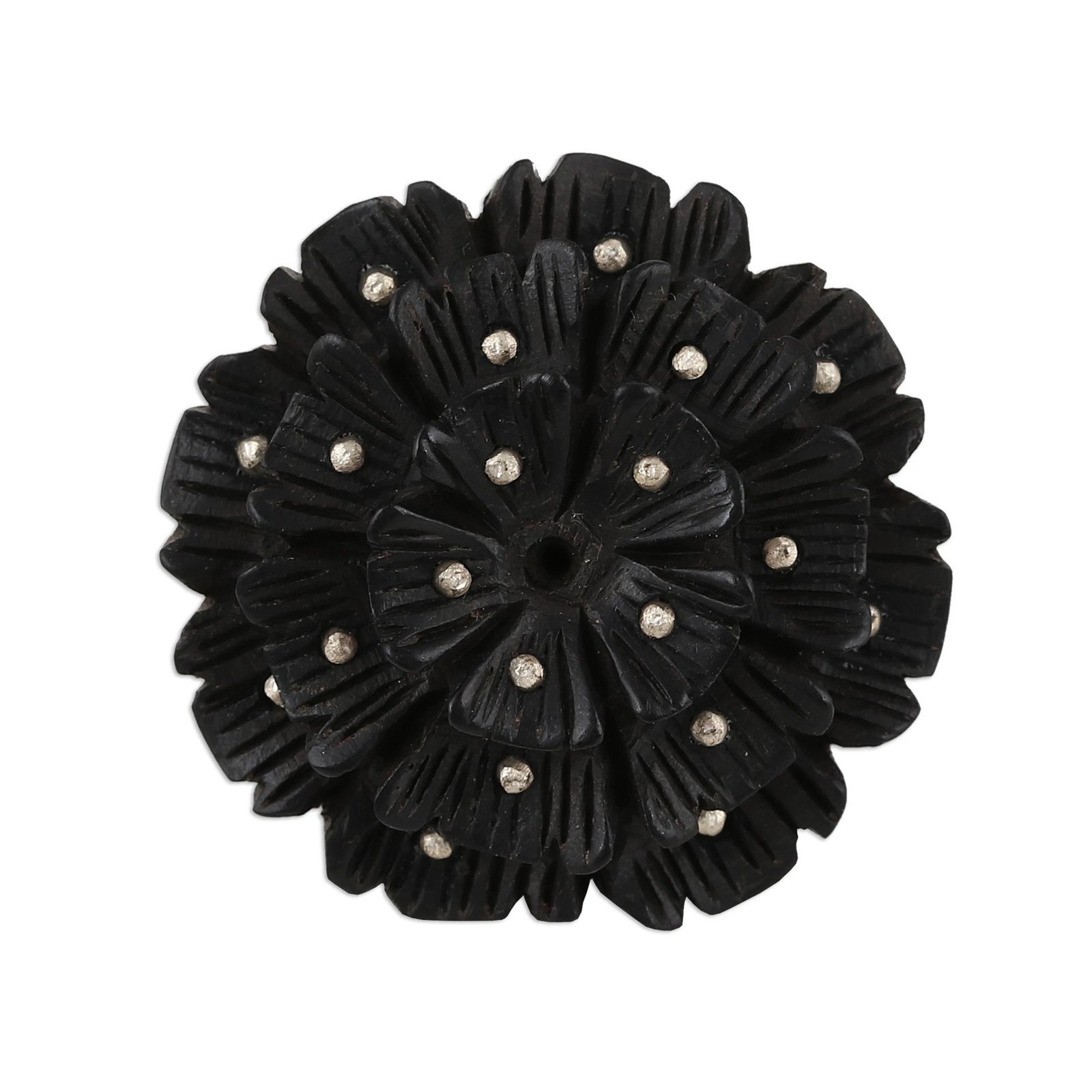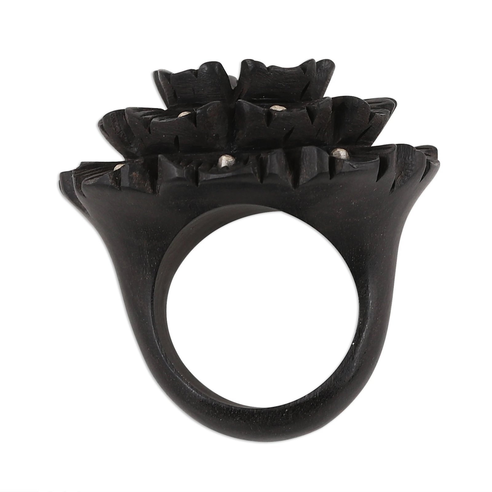 Hand-Carved Ebony and Sterling Silver Floral Ring. It is diligently hand-carved of a single piece of ebony wood to depict a majestic flower, its petals dotted with sterling silver accents.